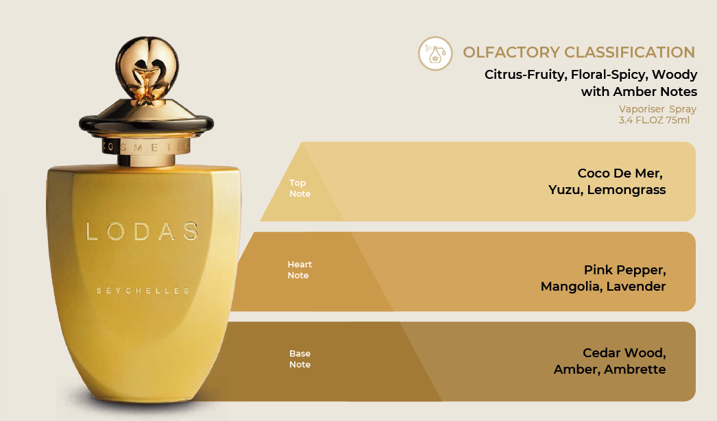 ts gold color to odbicie wschodzącego słońca o świcie na oceanie. Dynamiczna nuta głowy Coco de Mer i trawy cytrynowej sprawia, że ​​jest to idealny zapach zarówno dla mężczyzn, jak i kobiet. Nasze ciała objęte złotym promieniem słońca, odbijającym się w oceanie. Magia tej cennej chwili to wieczność miłości. Fale przesiąknięte trawą cytrynową i różowym pieprzem moczą nasze ciała na piasku. Lodas łączy magię Coco de Mer z młodością magnolii i różowego pieprzu, zachowując jednocześnie klasyczny akcent bursztynu i drewna cedrowego.